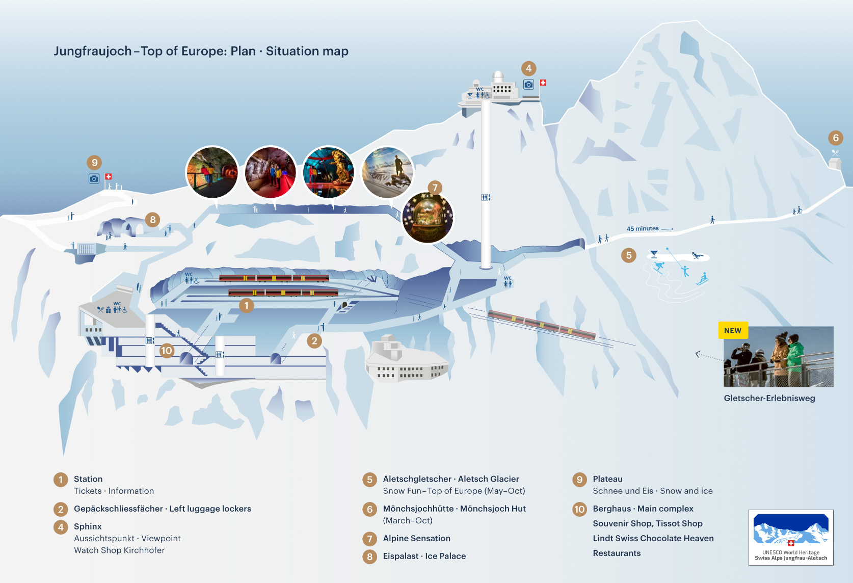 Alle Attraktionen am Jungfraujoch im Überblick. Zum Vergrößern der Karte bitte auf das Bild klicken.
