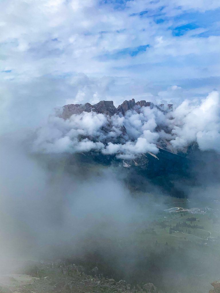 Dabei hätten wir hier am höchsten Punkt so ein geniales Panorama haben können. Wir hätten bis zur Rosengartenspitze schauen können, hätten die Marmolada, die Sella-Gruppe und sogar bis in die Ötztaler und Zillertaler Alpen blicken können. Aber all das bleibt uns heute verwehrt.