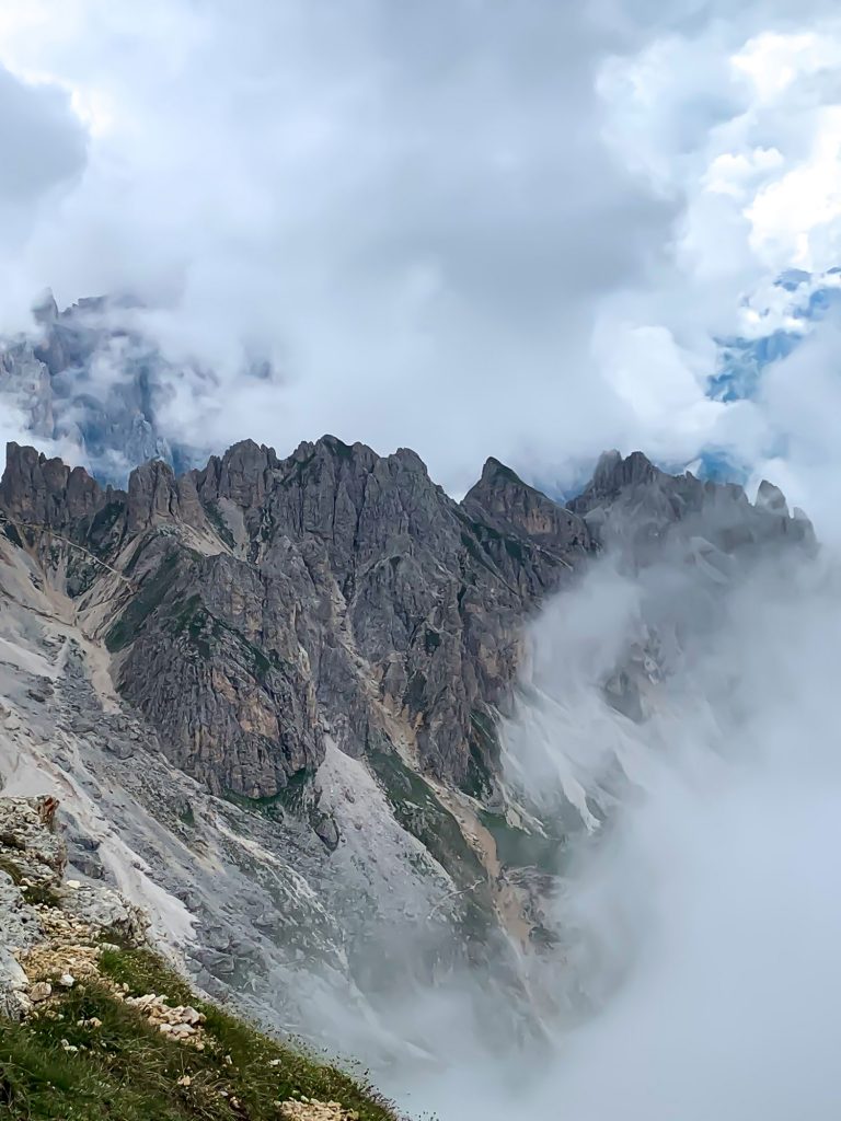 Der verzieht sich nämlich langsam wieder und legt die umliegenden Felszacken frei. Es ist genial schroff. Ich sauge das Panorama, das ich am Gipfel nicht hatte, aber jetzt umso mehr genieße, in vollen Zügen auf. Es ist super, zwischen den Felstürmen der Dolomiten unterwegs zu sein.