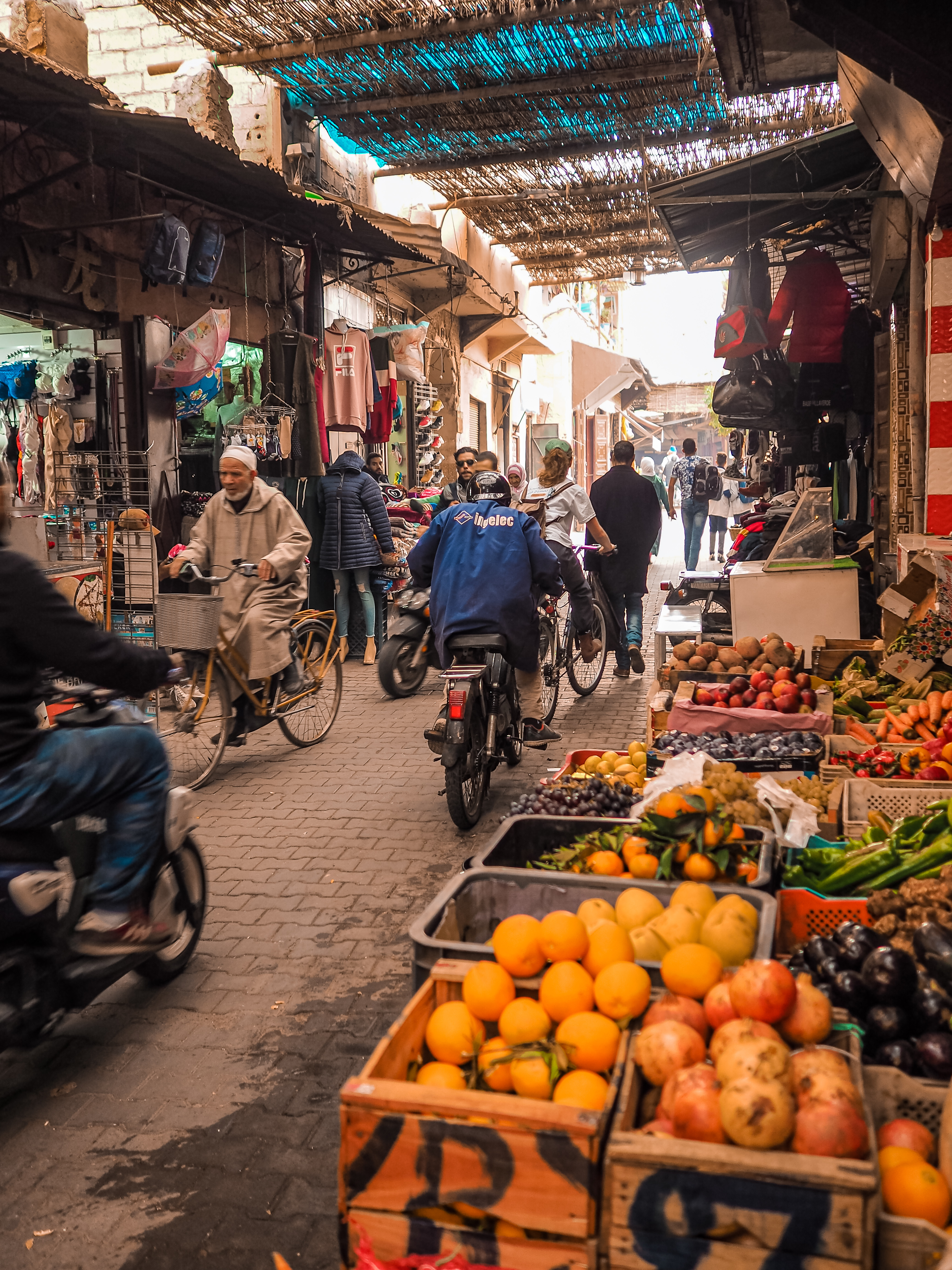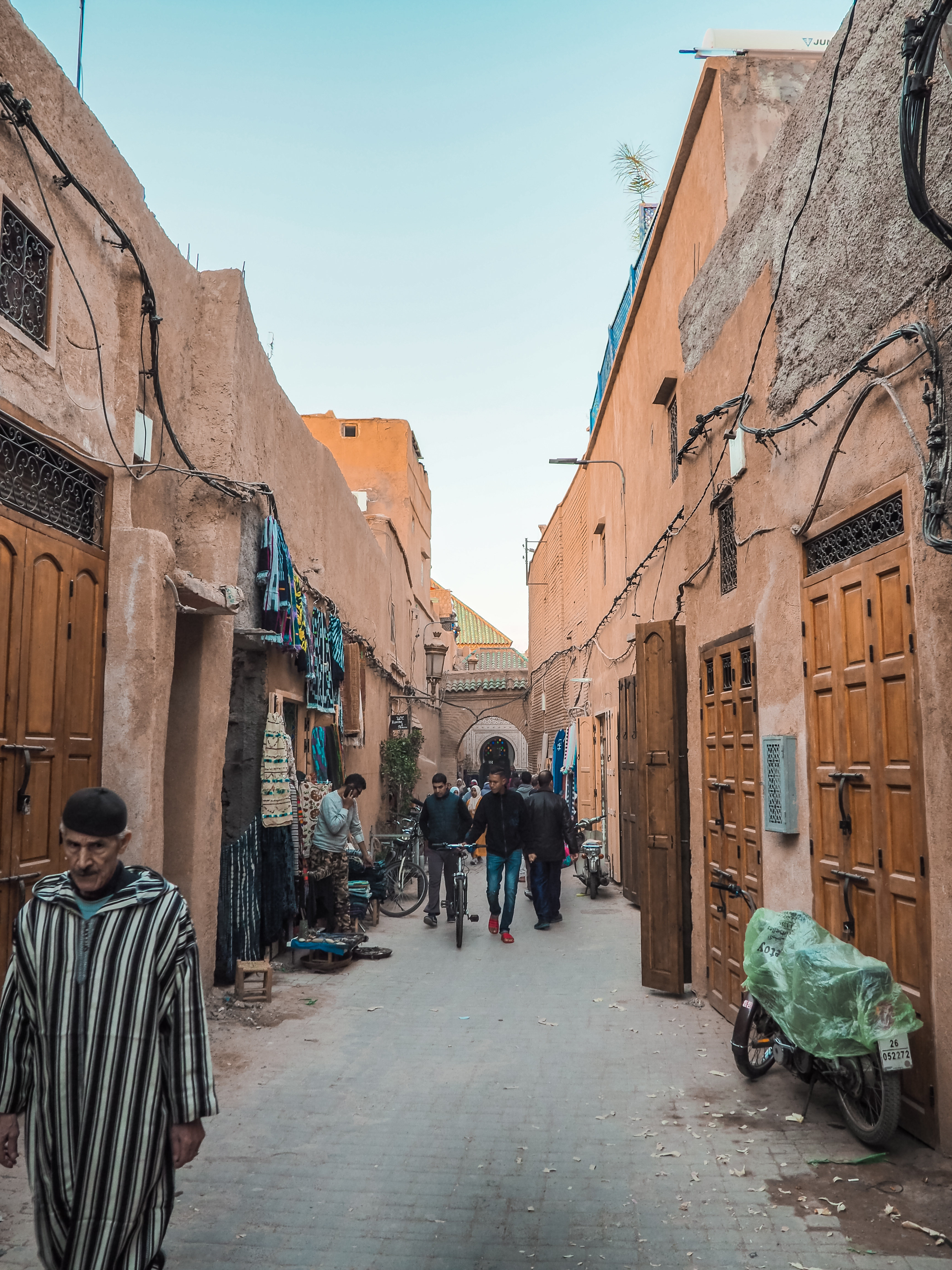 Am Bab Doukkala trennen sich die Wege von meiner Taxi-Begleitung und mir. Für mich geht es zu Fuß weiter in die Medina. Ab hier überflutet Marrakesch alle fünf meiner Sinne und das ständig und unaufhörlich mit neuen und vor allem fremden Informationen. Ich brenne schon darauf, den schweren Rucksack endlich loszuwerden und mich tiefer ins Abenteuer zu stürzen. Obwohl die Altstadt weitestgehend autofrei ist, sollte Vorsicht auf der Straße geboten sein, denn die Roller und Mofa-Fahrer versuchen sich zwischen Fußgängern und bepackten Schleppeseln möglichst schnell einen Weg zu bahnen.