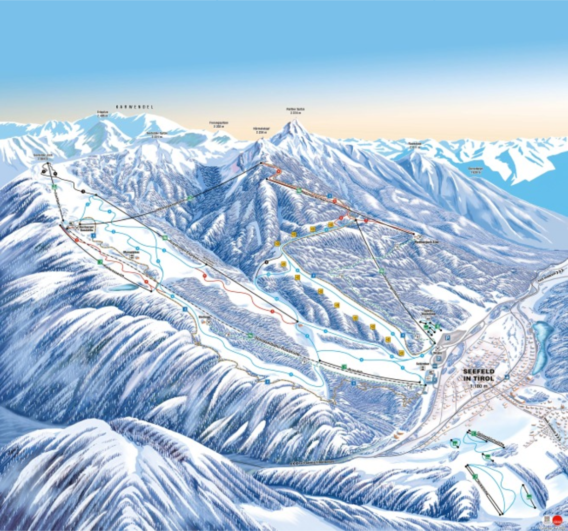 Alle Abfahrten und Liftanlagen in Seefeld im Überblick. Zum Vergrößern des Pistenplans bitte auf das Bild klicken.