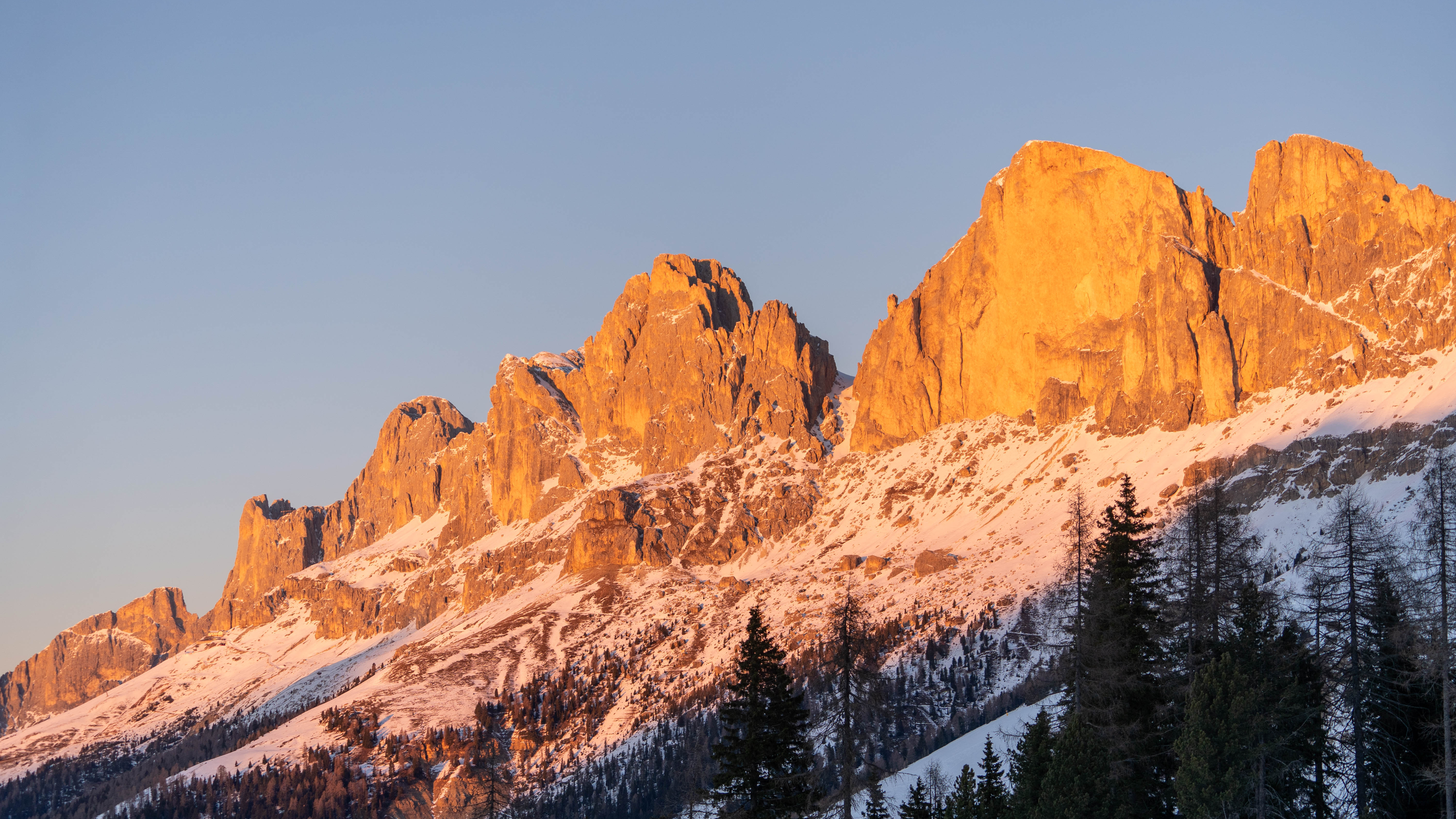 Abends liegt ein besonderer Zauber in der Luft. An klaren Tagen leuchten die schroffen Dolomitenwände zur Zeit der Dämmerung in den unterschiedlichsten Farben. Das wahre Naturschauspiel kommt während den letzten Sonnenminuten zur Geltung. Dann erstrahlt der Rosengarten, angeleuchtet von der Sonne, in Rot. Ein wunderschöner Abschluss des Skitags, den ihr auf keinen Fall verpassen solltet.