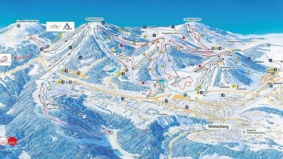 Alle Abfahrten und Liftanlagen im Skikarussell Winterberg im Überblick. Zum Vergrößern des Pistenplans bitte auf das Bild klicken.