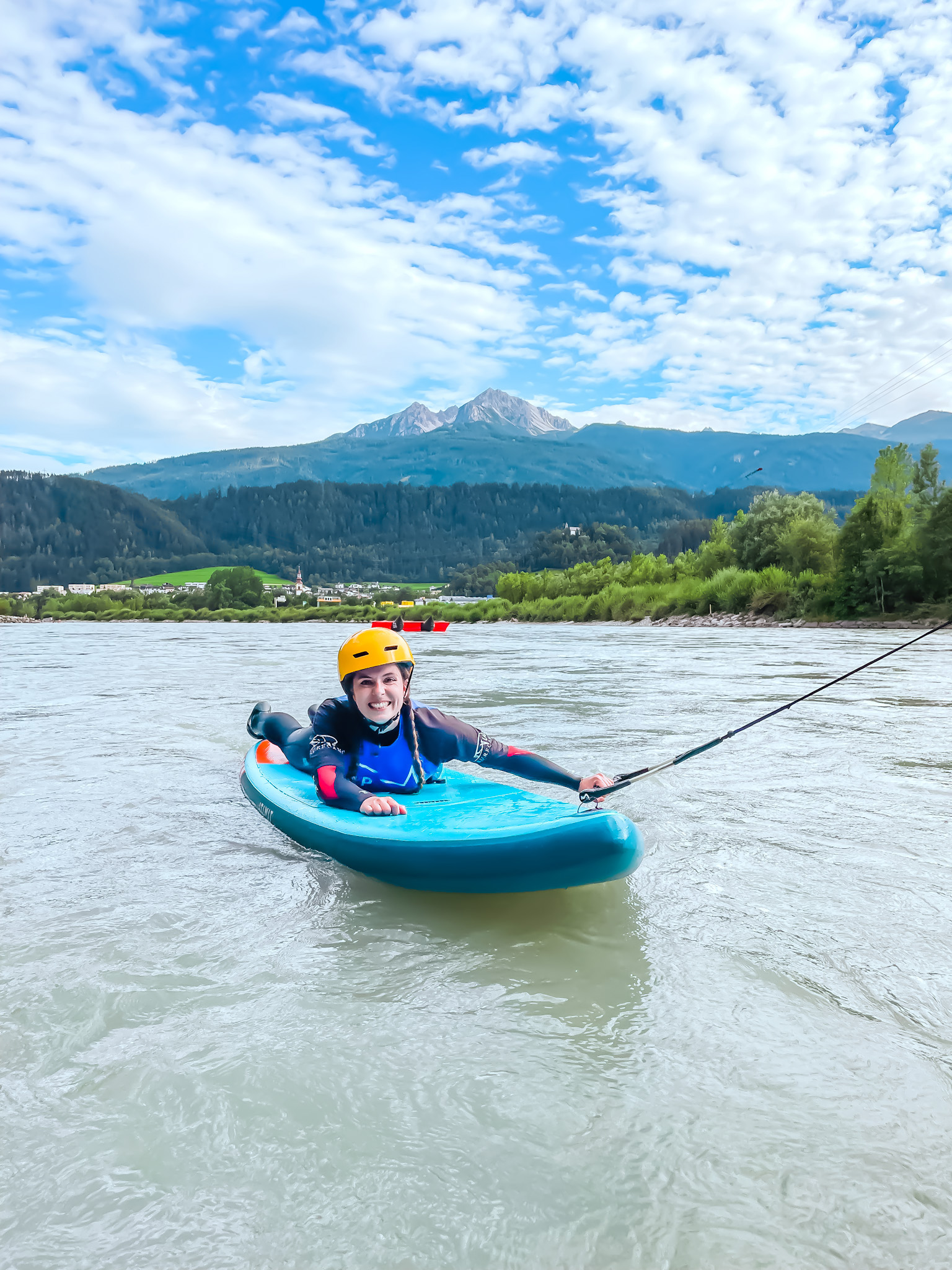 Ich liege bäuchlings auf dem Surfbrett und halte mich mit einer Hand an einem Seil fest, um nicht von der Strömung des Inns mitgerissen zu werden. Währenddessen gehe ich im Kopf den Ablauf durch: Aufstehen, Gleichgewicht halten und Spaß haben beim Surfen. Das klingt so easy. Die ersten Versuche haben mir allerdings gezeigt, dass es gar nicht so leicht ist. Trotzdem soll der Surfspot in Innsbruck auch für Anfänger gut geeignet sein. Also probiere ich es gleich nochmal …