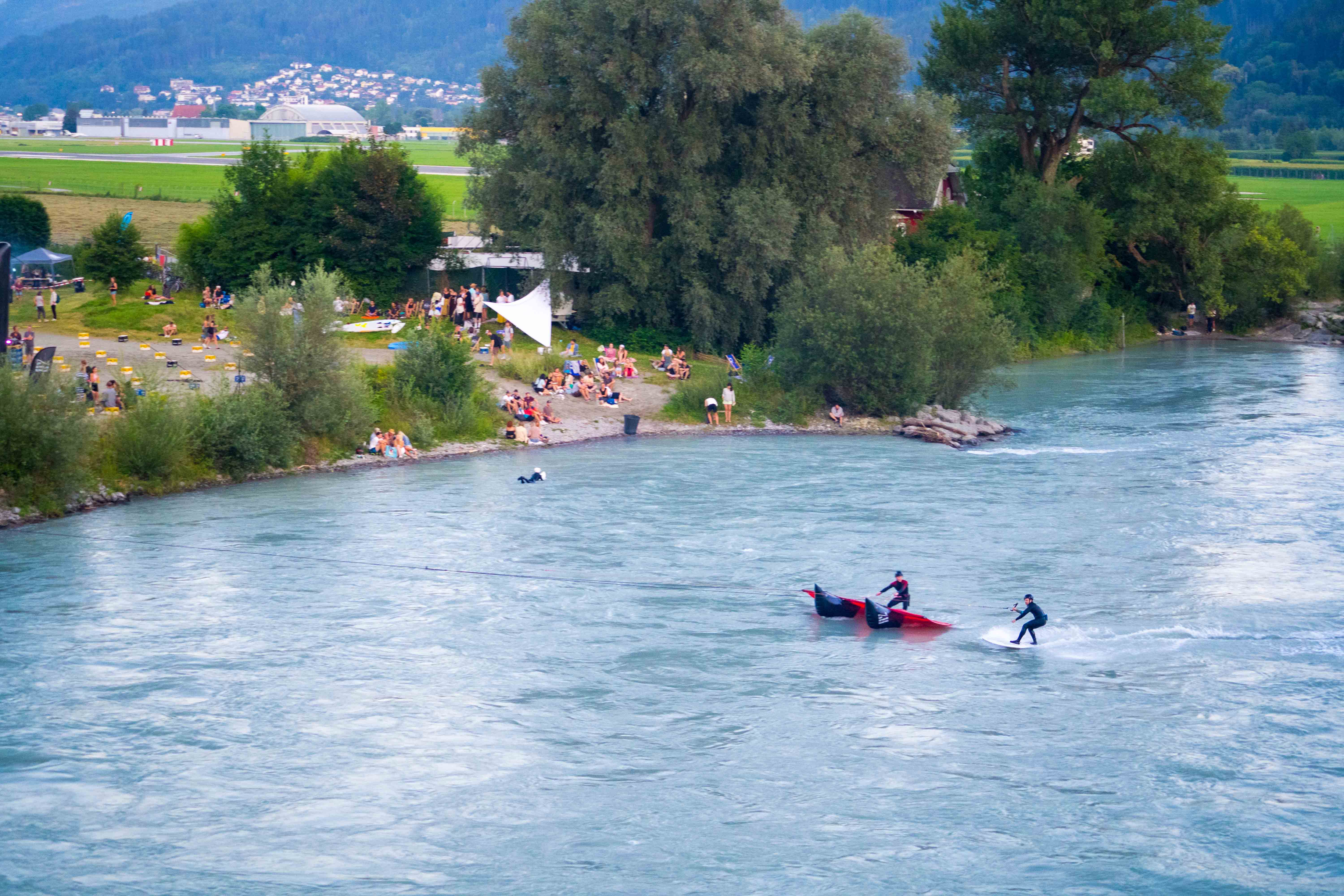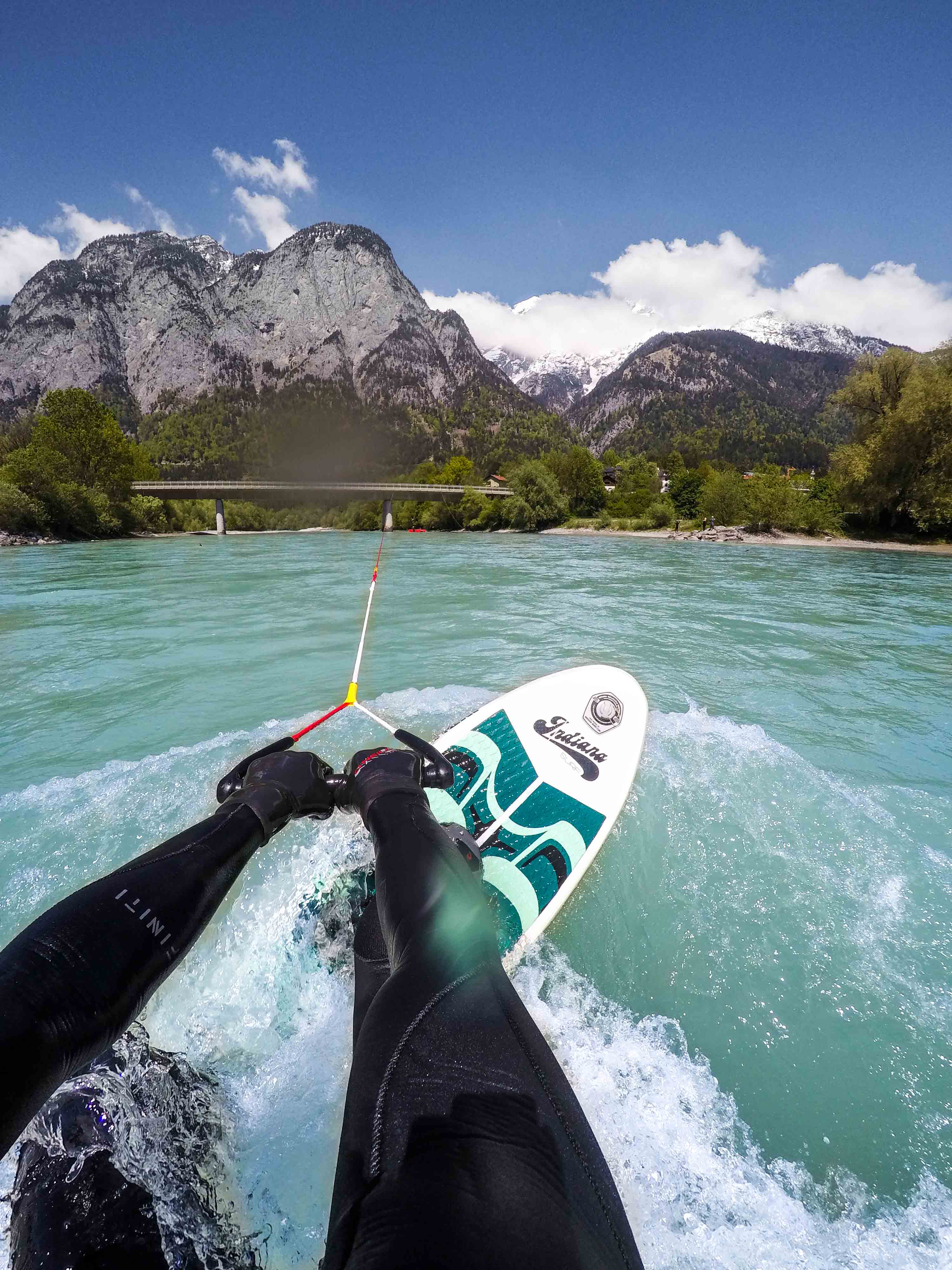 Wenn ihr dort die ersten Sekunden sicher und gut steht, wird es richtig rasant. Es gibt nämlich noch eine andere Möglichkeit, über das Wasser zu rauschen. Mitten im Inn befindet sich eine Art Segel im Wasser. Durch Druck und Gewichtsverlagerung wird es zum Widerstand. Und wenn ihr euch dann an dem Griff festhaltet, der mithilfe eines Flaschenzugsystems an der Konstruktion befestigt ist, wird es super sportlich. Dann könnt ihr über eine Strecke von 300 m auf 30 km/h beschleunigen.