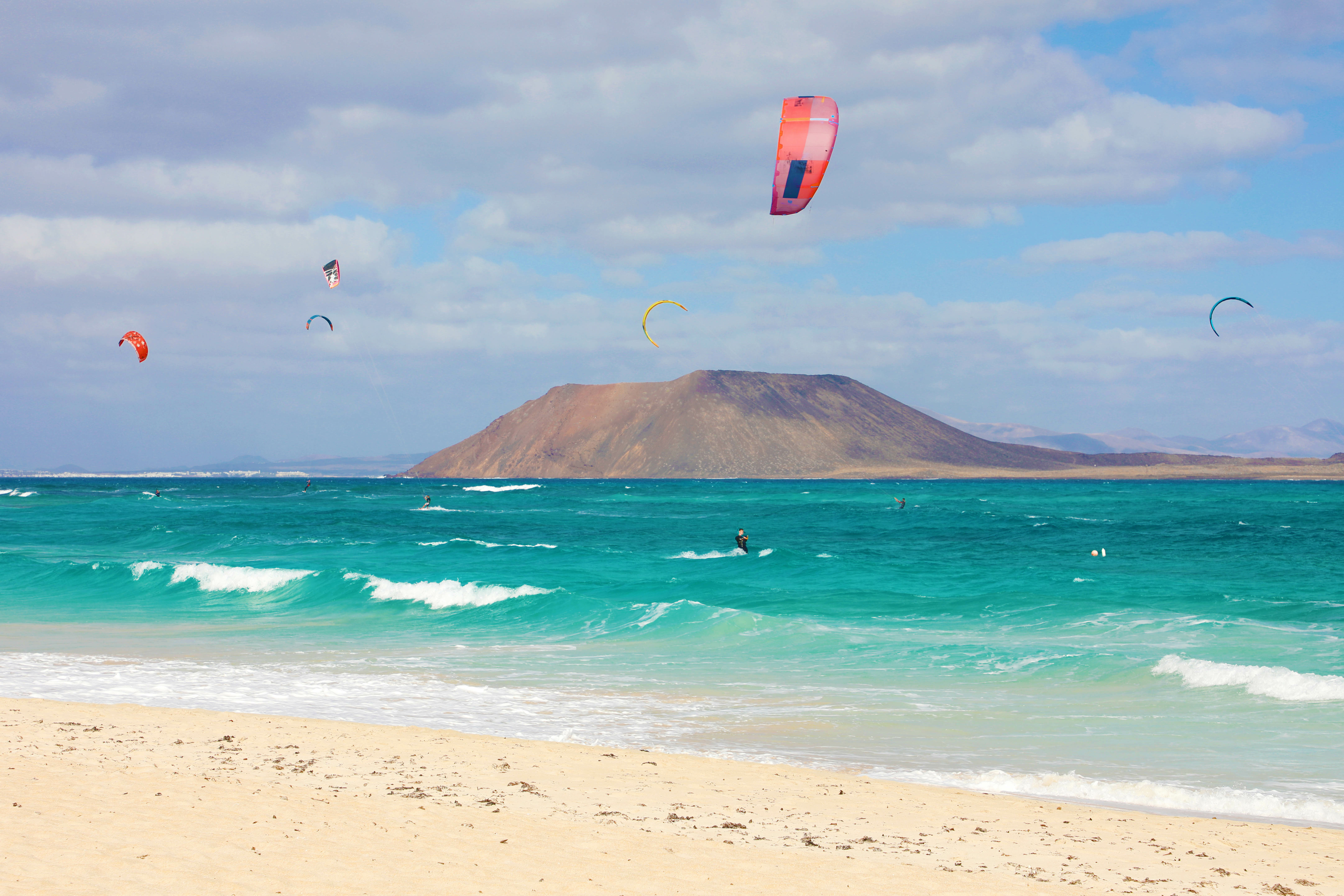 Fuerteventura hat eine sehr lange Windsaison, sodass ihr hier das ganze Jahr über Kitesurfen könnt. Rund 100 Kilometer vor der afrikanischen Küste liegt die kanarische Insel und ist auch in den Wintermonaten mit angenehmen Temperaturen gesegnet. Hier weht ein leichter bis mäßiger Nordost Passat, der im Sommer sogar durch einen Düseneffekt zwischen den Bergzügen beschleunigt wird.