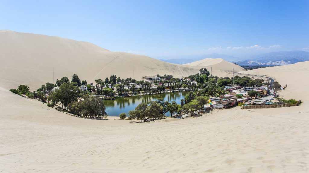 Das Klima zwischen Anden und Pazifik ist wüstenhaft. Südlich von Lima findet ihr die einzige Oase Südamerikas. Unweit von Ica versteckt sie sich wie eine Fata Morgana mit einem See inmitten von hoch aufragenden Dünen. Der Blick auf Oase und Lagune ist vor allem bei Sonnenuntergang unsagbar schön.