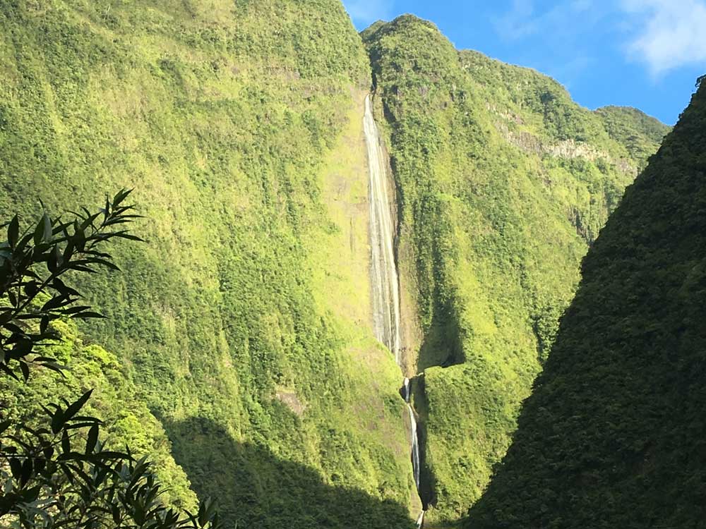 Mit jedem Schritt scheint die Bergwelt noch schöner zu werden. Pause machen wir am Les Trois Roches, einem Wasserfall, der in einer tiefen Felsspalte im Boden versinkt. Am Ende des Tages geht es wieder 800 Höhenmeter nach oben zum Col Des Boeufs auf der anderen Seite des Mafats.