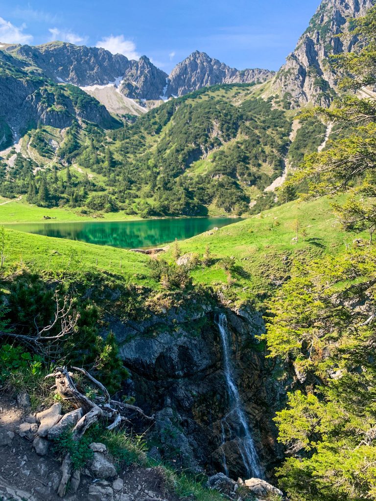 Die Belohnung folgt auf dem Fuß. Denn kaum verlassen wir den Wald, erblicken wir einen tollen Aussichtspunkt auf den Unteren Gaisalpsee mit dem Wasserfall, der über die steile Felsstufe davor in Richtung Tal donnert. Dahinter erhebt sich das Rubihorn. Der Wasserfall ist im Winter übrigens auch bei Eiskletterern beliebt.